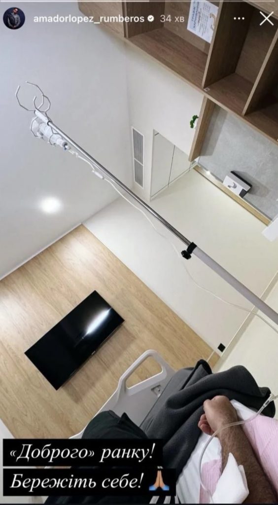 Зокрема, шоумен поділився, що потрапив до лікарні. Про це він розповів в Instagram-stories та опублікував відповідне фото з медзакладу. На знімку артист був зображений у лікарняній палаті. Амадор Лопес лежав на ліжку, тим часом до його руки була приєднана система крапельниці.