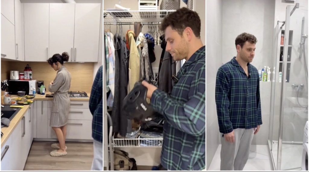 Пара запросила блогерку до своєї орендованої квартири, у якій живе вже півтора року. Під час рум-туру подружжя показало оселю, пригостило сніданком, після чого Євгенія разом із гостею відвезли сина Лева до школи та відвідали шоурум артистки. Завершився день репетицією Артура в театрі.