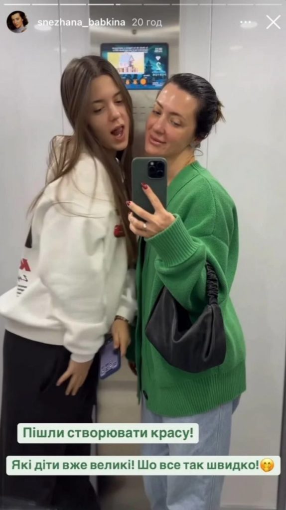 Веселина була одягнена в чорні штани та біле худі, а своє довге волосся вона розпустила. Тим часом Сніжана Бабкіна обрала джинси, зелену кофтинку та доповнила образ сумочкою. Як зазначила артистка, вони “пішли створювати красу”. Цілком ймовірно, що акторка з донькою направилась до салону краси.