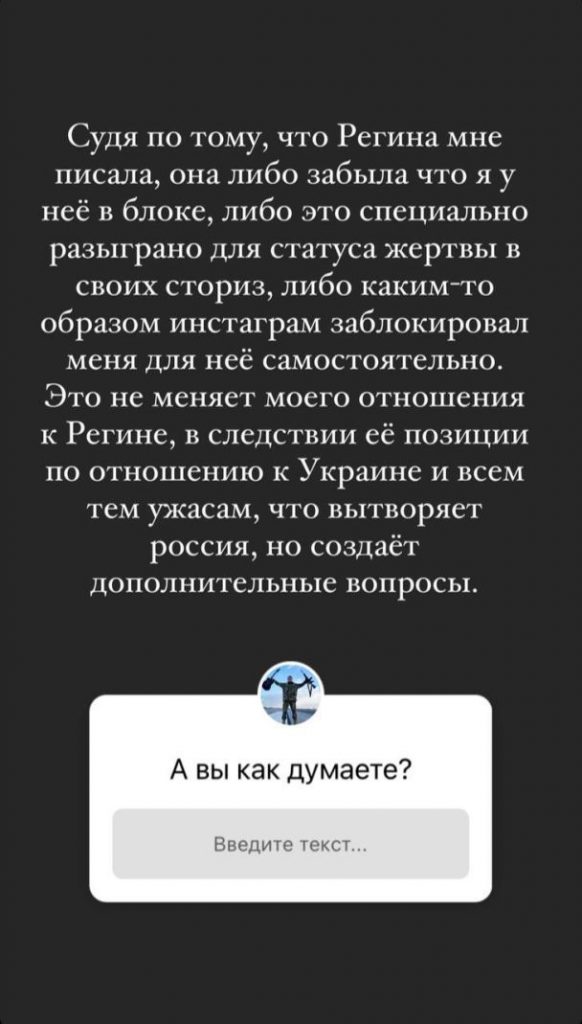 “З огляду на те, що Регіна мені писала, вона або забула, що я у неї заблокований, або ж спеціально це розіграла, аби зробити себе жертвою, або ж Instagram якимось чином заблокував мене самостійно. Це не змінює мого ставлення до Регіни, через її позицію стосовно України та всім тим жахливим речам, що творить Росія, але створює додаткові запитання”, – підкреслив Сєрга.