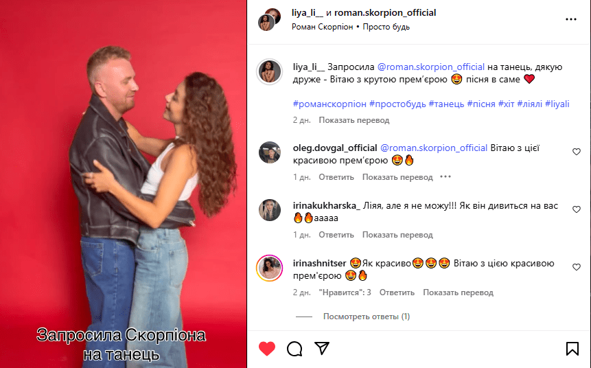 Українська поп-співачка Liya Li нещодавно поділилася з прихильниками в Instagram новим дописом, де танцює зі співаком Романом Скорпіоном. «Запросила Скорпіона на танець» — написала артистка, супроводивши повідомлення емоджі 🖤.