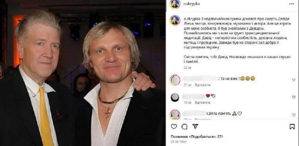 “З надзвичайним сумом дізнався про смерть Девіда Лінча, митця, кінорежисера, музиканта і актора. Але ця втрата для мене особиста. Я був знайомим з Девідом. Познайомились ми з ним на ґрунті трансцендентальної медитації. Девід – непересічна особистість, духовна людина, митець і провідник. Завжди був на стороні сил добра й підтримував Україну. Світла пам’ять тобі, Девіде. Назавжди лишишся в наших серцях і пам’яті”, – підкреслив Скрипка.