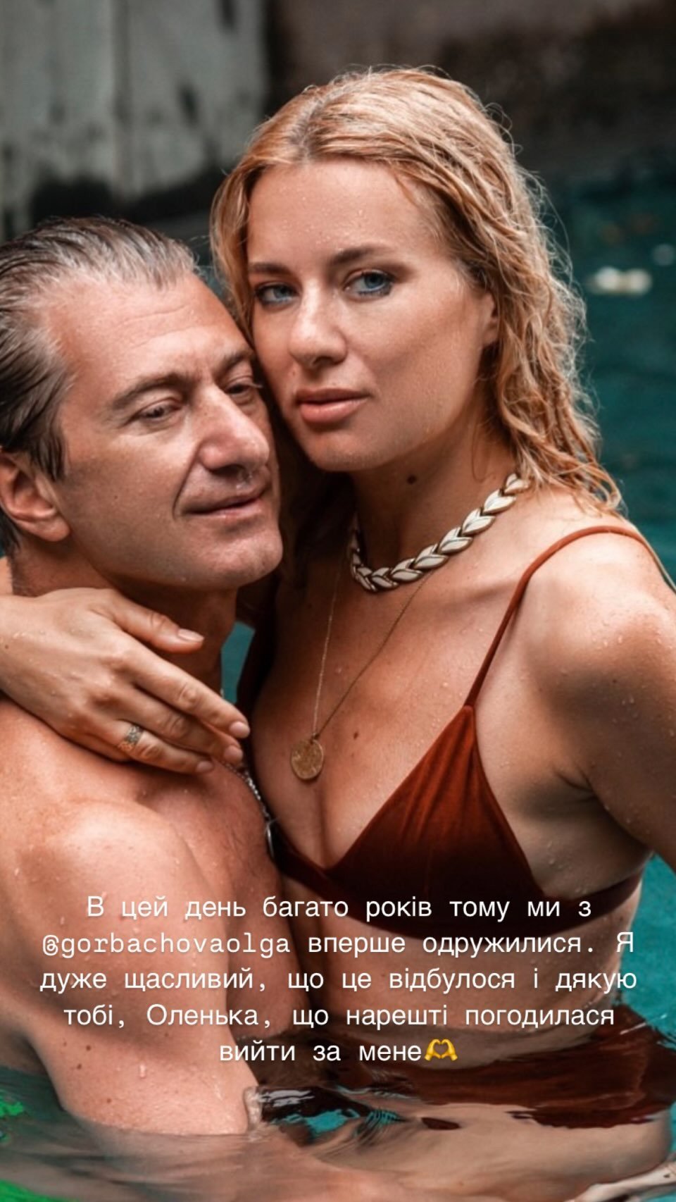 “Цього дня багато років тому ми з Ольгою Горбачовою вперше одружилися. Я дуже щасливий, що це відбулося. І дякую тобі, Оленько, що нарешті погодилася вийти за мене”, – зазначив продюсер.
