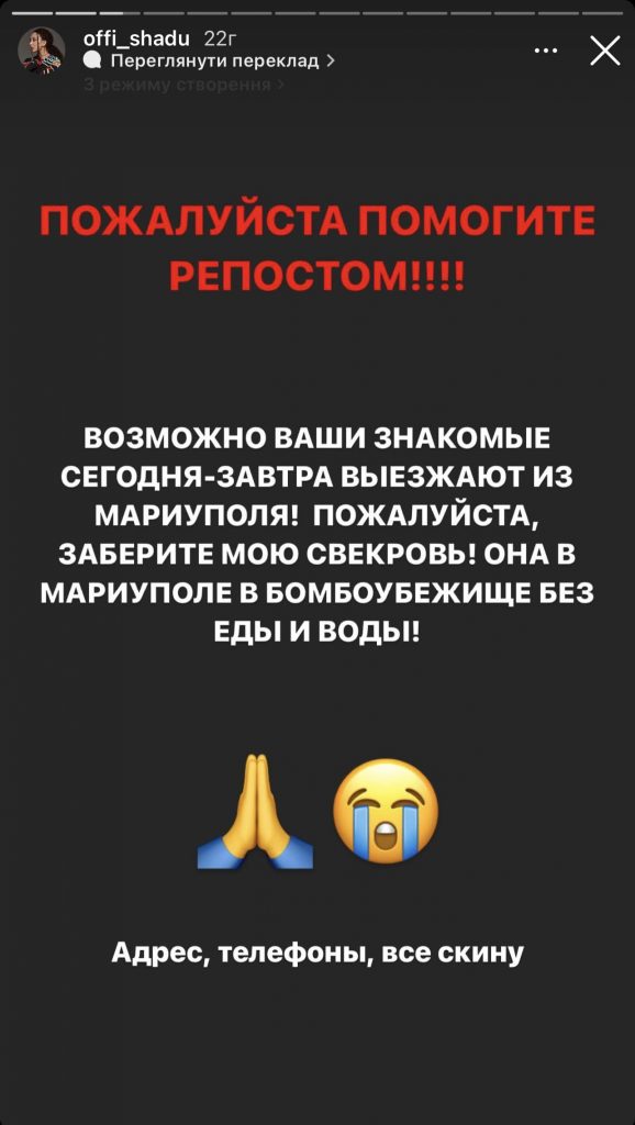 «Можливо ваші знайомі сьогодні-завтра виїжджають із Маріуполя. Будь ласка, заберіть мою свекруху. Вона в Маріуполі в укритті, без води та їжі», – закликала співачка