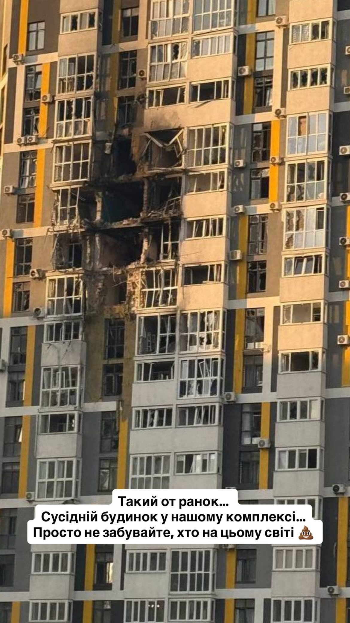 Ведучий Тімур Мірошниченко розповів, що його родина також пережила тривожну ніч. У житловому комплексі, де він мешкає з дружиною та дітьми, стався “приліт”, а ще один удар припав на сусідній будинок. Мірошниченко показав наслідки обстрілу, продемонструвавши пошкоджену багатоповерхівку.