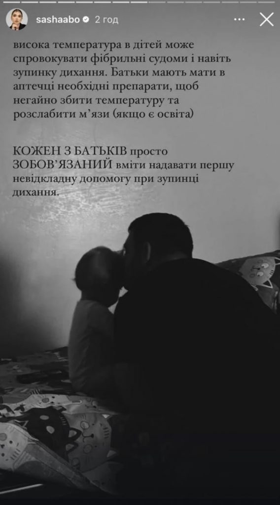 “Вчора (18 грудня – прим. ред.) був найстрашніший день мого життя, вже все позаду. Висока температура в дітей може спровокувати фібрильні судоми і навіть зупинку дихання. Батьки мають мати в аптечці необхідні препарати, щоб негайно збити температуру та розслабити м’язи (якщо є освіта). Кожен з батьків зобов’язаний вміти надавати першу невідкладну допомогу при зупинці дихання. Я вперше в житті робила штучне дихання своїй дитині. Я не знаю, як забути вчорашній день, якщо він поділив моє життя на до і після”, – поділилася блогерка.