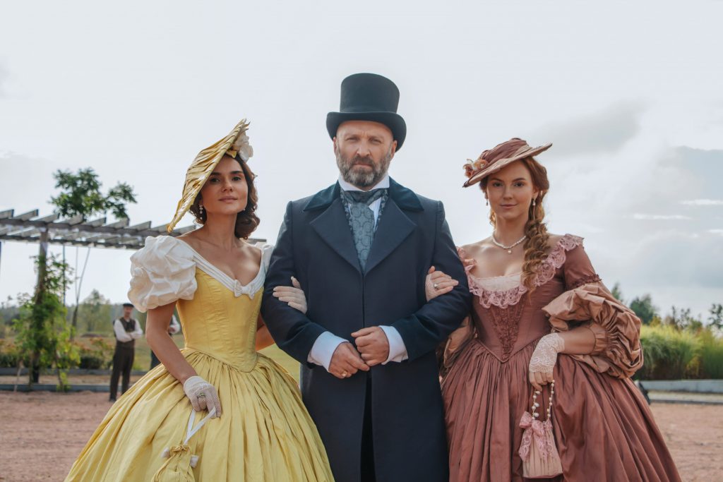 Я не рахувала точно, але приблизно було шість костюмів: дві бальні сукні, чотири повсякденні образи та кумедний домашній халатик із бігудями в одній сцені.